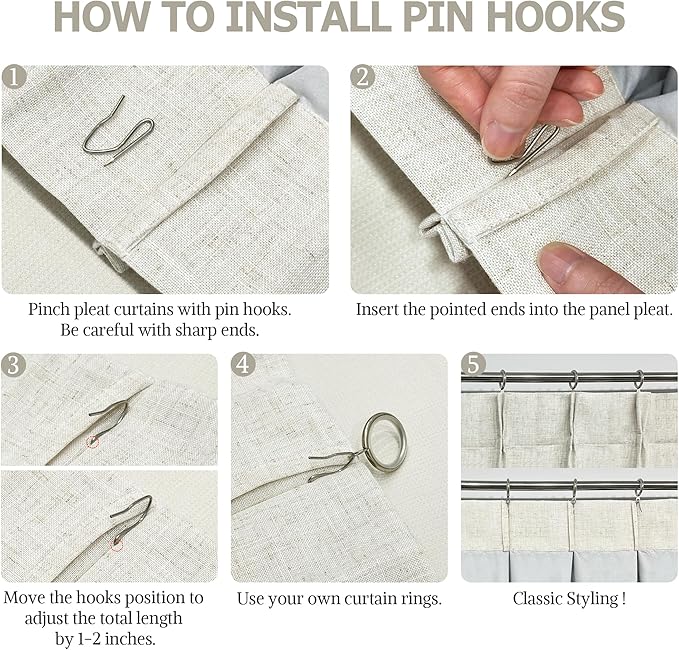 - Pinch Pleats Design:Each beige curtain panel with 7 pinch pleats generates modern and luxury feel.Linen curtains provide a natural,organic,and textured look that complements a variety of interior styles.By offering linen curtains in various colors,patterns,and lengths,we can cater to customers looking for a casual yet sophisticated window treatment.Hanging these pinch pleat curtains to elevate your windows and increase the aesthetic value to any spaces,bedroom,living room,nursery,office,etc.