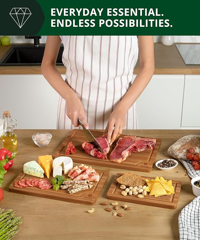 ROYAL CRAFT WOOD Wooden Cutting Boards for Kitchen Meal Prep & Serving - Bamboo Wood Serving Board Set with Deep Juice Groove Side Handles - Charcuterie & Chopping Butcher Block for Meat (3 Pcs)