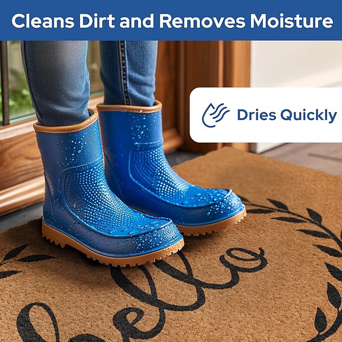 - Versatile - Our Hello wreath doormat outdoor entrances is not only perfect for patios, but also makes a great welcome mat for outdoor events or camping trips. Its durable construction is perfect for cleaning dirt and debris from shoes, and the all-weather coir fibers dry quickly. Use it to welcome guests to your home, cabin, or RV.