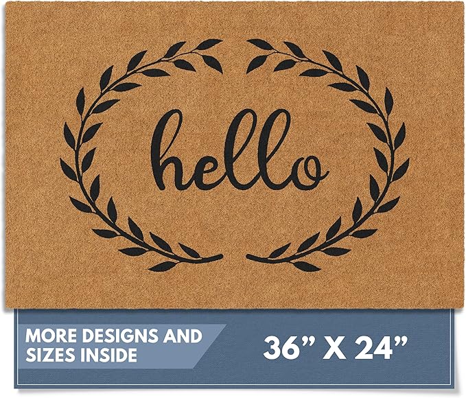 - Say Hello in Style - Welcome guests into your home with our eye-catching Hello Doormat with wreath detail; it’s the perfect indoor or outdoor welcome mat for front door. The doormat’s bold design and large lettering make it impossible to miss, adding a touch of charm to any entryway.