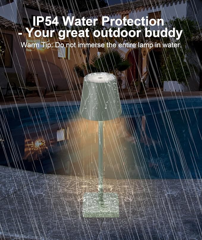 - Cordless Lamp Design: This cordless table lamp is made of all-aluminum metal body, the surface of the frosted coating process, IP54 water protection, can be used outdoors