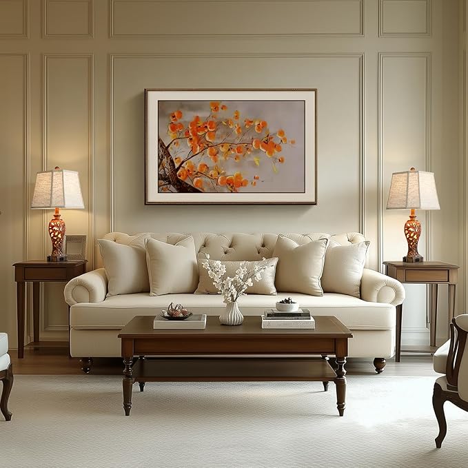 Add warmth to your living room with cozy cushions, layered textures, and autumn-themed wall art for a stylish Thanksgiving setup.