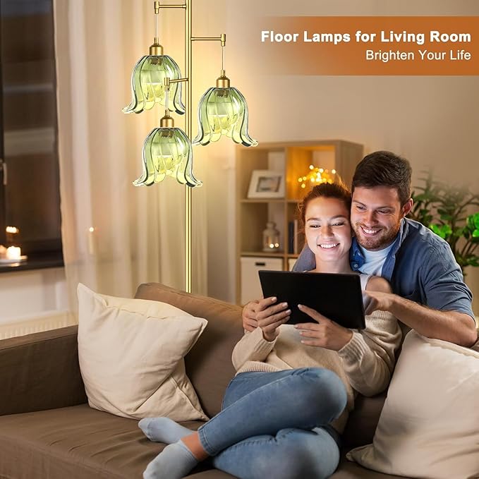 Gold Floor Lamp for Living Room,Bedroom,Tree 3 Light Standing Lamp Mid Century Modern Brass Tall Floor Lamps Vintage Retro Floor Lights Green Glass Flower Lamp Shade Farmhouse Boho Bohemian