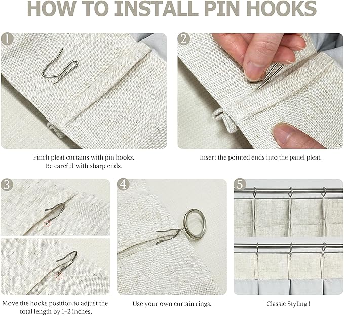 - Multiple Hanging Ways:The luxury curtain have many hanging options to meet your different home décor needs:back tabs(4 inch),clip rings,ring hooks or for track system. Please note that 12 hooks are in the package but clips and rings are not included.Two weighted hems sewn at bottom increase the draping effect.Moving the pinhooks position to adjust the total height by 1-2 inches