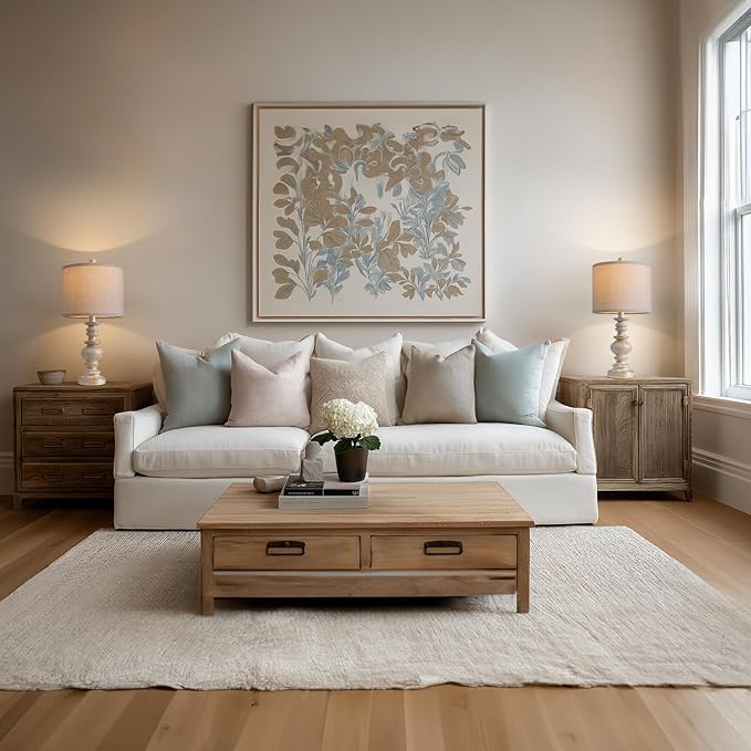 Add warmth to your living room with cozy cushions, layered textures, and autumn-themed wall art for a stylish Thanksgiving setup.