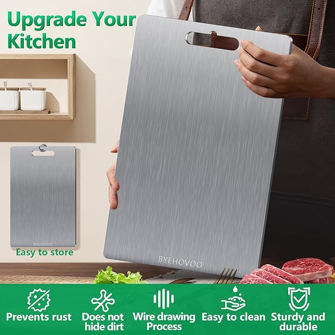 - 【Double Sided Titanium Board & Lightweight】 Made of premium titanium,ideal for raw meat,vegetable,fruit and allergy-sensitive cooking. titanium’s non-porous surface easy to clean,Wood board* (absorbs moisture) *and plastic board* (deep knife grooves).50% lighter than steel chopping boards but 3x more durable than wood and plastic board.All corners are designed with smooth edges, which will not cut your hands during daily use.Warp-proof, and heat-resistant (up to 600°F), perfect for daily use and outdoor camping.