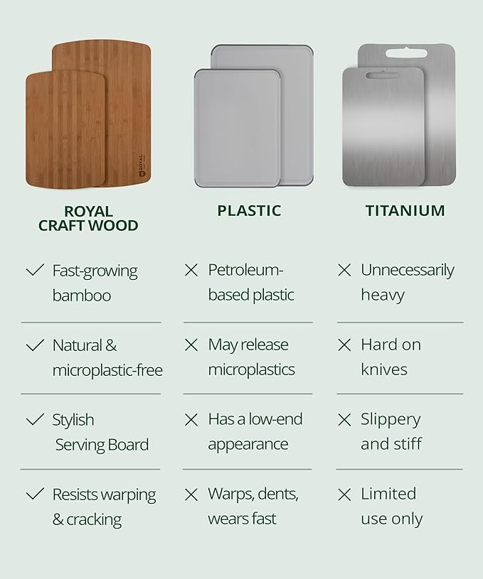 - πππ% πππππππππππ, πππππππ ππππππ πππππππππ: The Royal Craft Wooden Cutting Board Set, environmentally conscious in design, is made of premium, renewable bamboo & completely food safe for your peace of mind. Our bamboo serving board set is resistant to warping, splintering, or peeling. Featuring a beautiful wood grain design, they are perfect for charcuterie & other appetizer spreads. Easy to clean, hand wash under warm water with soap.