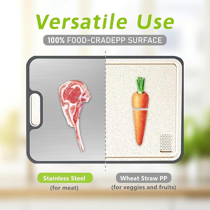 - 【2-in-1 Cutting Board】This product is a two-in-one multi-functional integrated composite cutting board. One side is made of stainless steel (for cutting raw meat and cooked meat), and the other side is made of orange-peel PP (for cutting vegetables and fruits). You can switch the usage panels according to different foods, making it more suitable for household use.